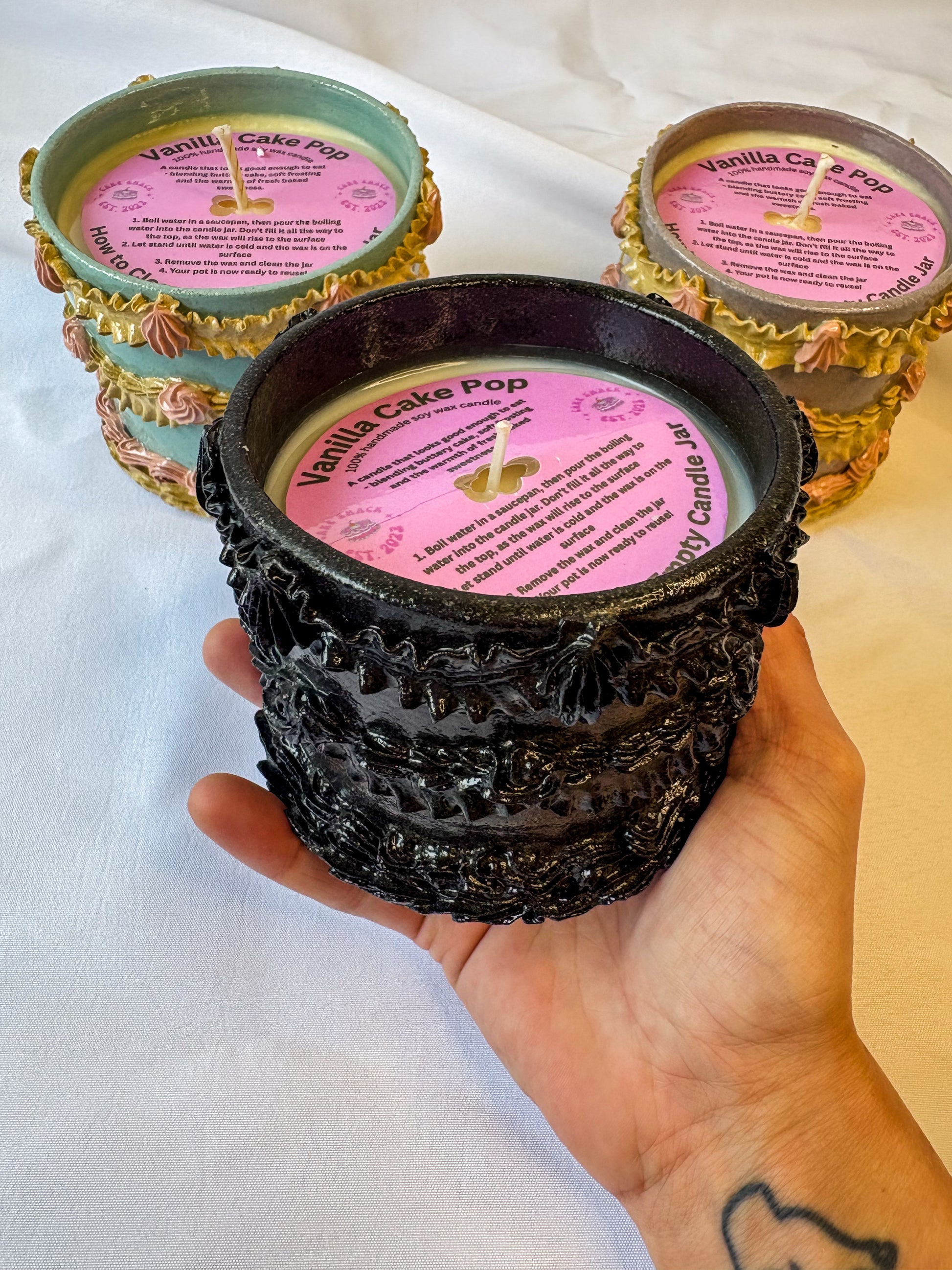 Comes in 6 different colors - pink, purple, blue, green, black and rainbow. As well as the pink ceramic cake design with pink soy wax also vanilla cake pop scented.