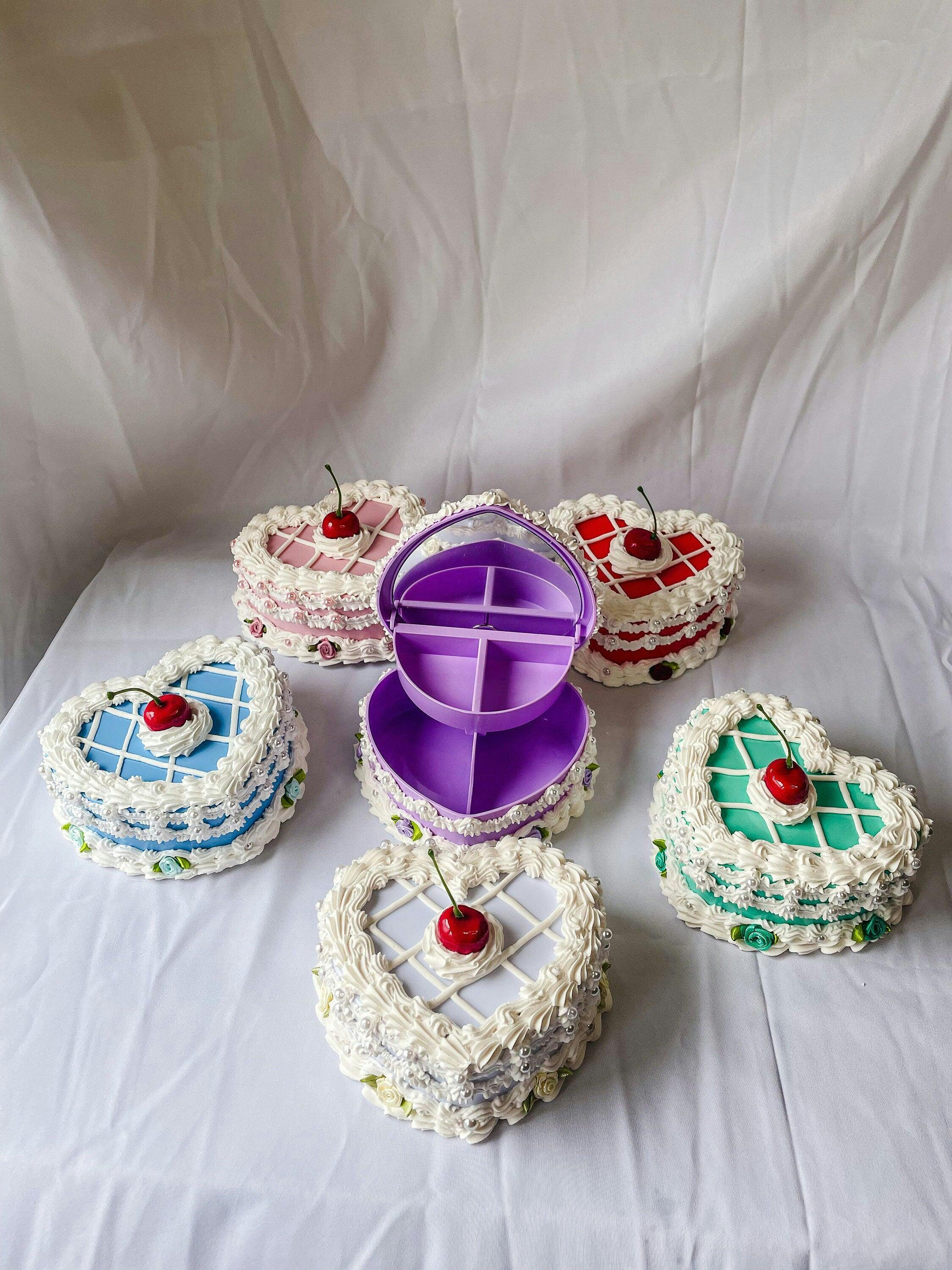 Customizable Plastic heart fake cake jewelry box with 4 compartments and a mirror.