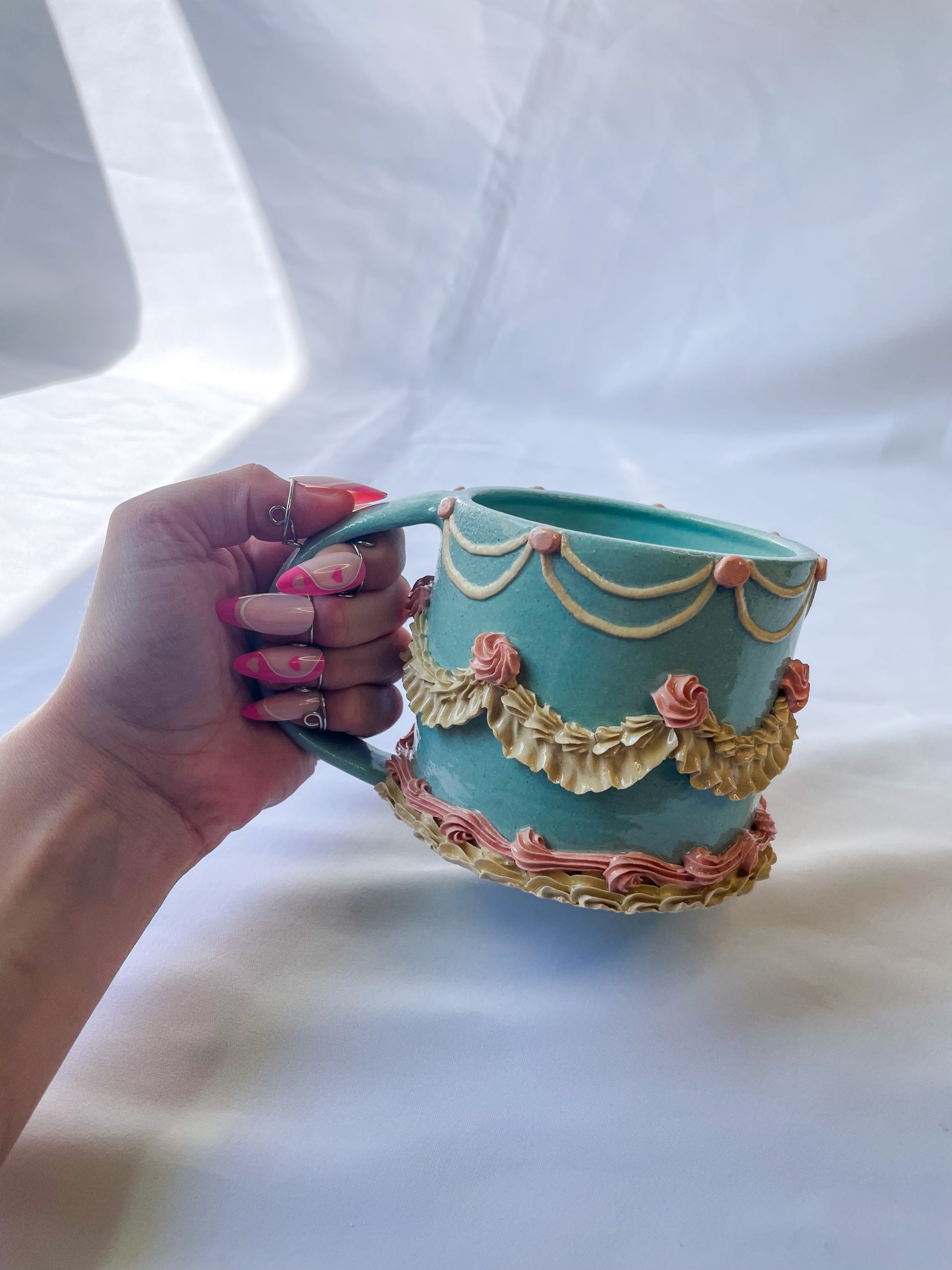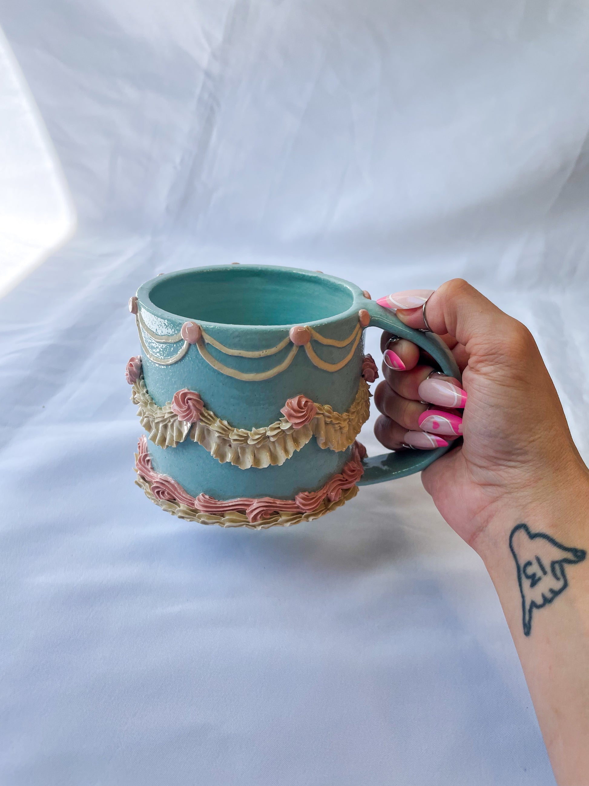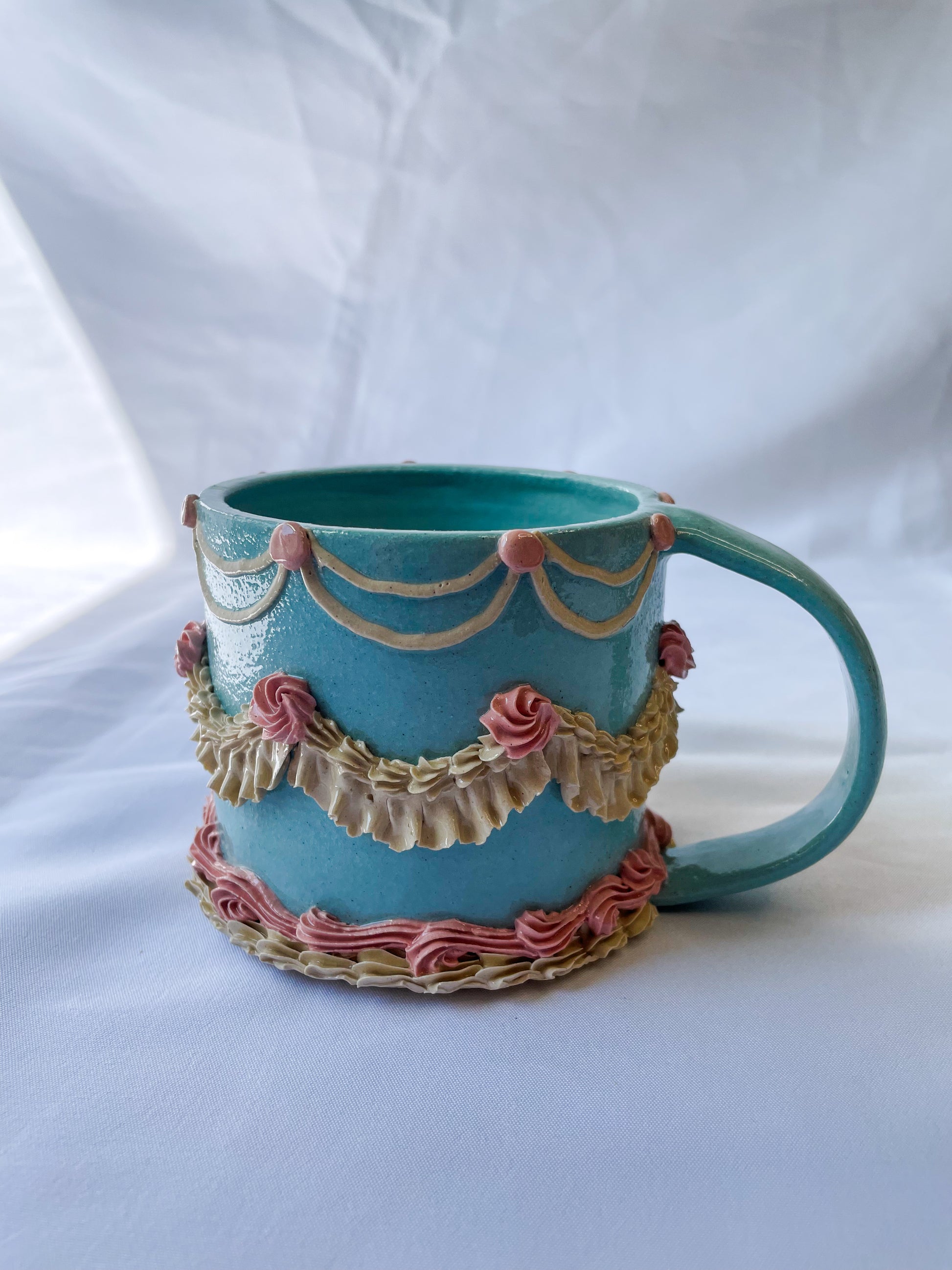 Ceramic Mug sculpted to look like a cake featuring a light blue base, with light pink and white vintage cake piping.